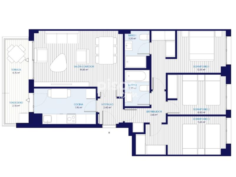 Piso a estrenar, completamente nuevo. Urbanización privada, piscina, portería fisica, local comunitario. Tiene 3 habitaciones y 2 baños (uno en suite), es un piso que tiene doble orientación lo que mejora la eficiencia energetica y la ventilación, es exterior en la parte de sus habitaciones y es interior en la parte de cocina y terraza.