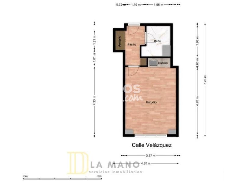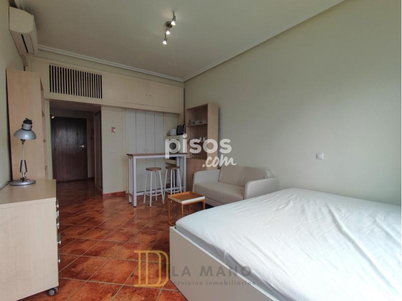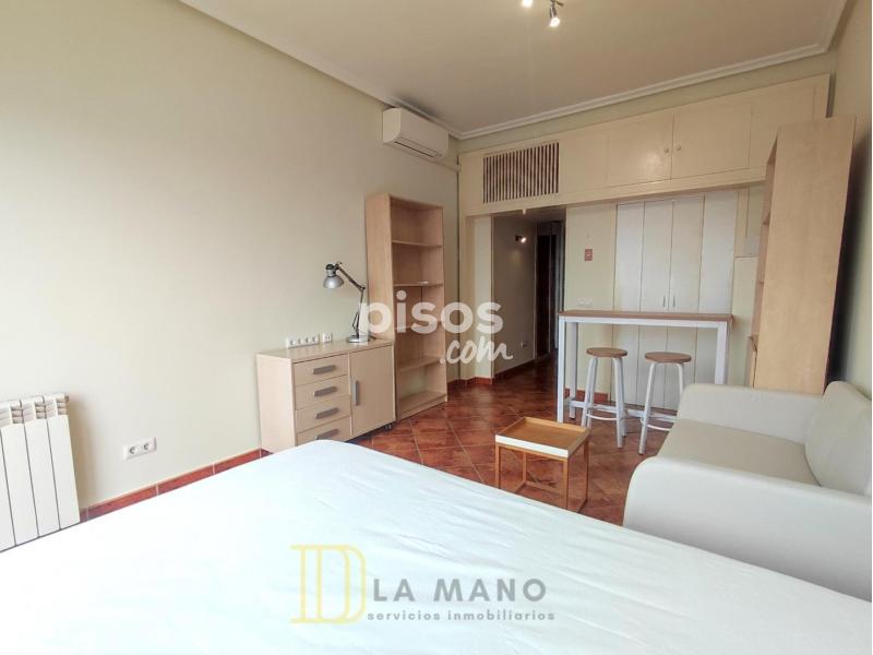 DE LA MANO Servicios inmobiliarios alquila esta octava planta exterior con una luz espectacular y unas vistas despejadas del skyline madrileño. Se trata de un estudio diáfano con cocina francesa, baño independiente completo y dos armarios empotrados dobles. Sin duda, su gran atractivo lo aporta una terraza corrida en la que disfrutar del atardecer todo el año. Se encuentra en muy buen estado y con la mayor parte del mobiliario casi nuevo, listo para ser habitado. Tiene calefacción central incluida en el precio, ventanas con climalit, puerta blindada, aire acondicionado… y se enclava en una finca señorial con dos ascensores, portero físico y automático, acceso para personas con movilidad reducida y un portal de bandera.