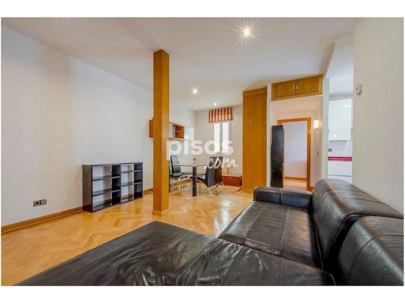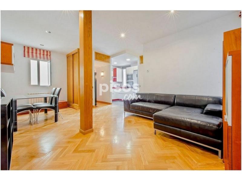 Salón y comedor amueblados con mesa y sillas de comedor, sofá, estanterías y mueble para TV. Dormitorio principal con cama y mesillas. Dormitorio secundario con sofá cama.