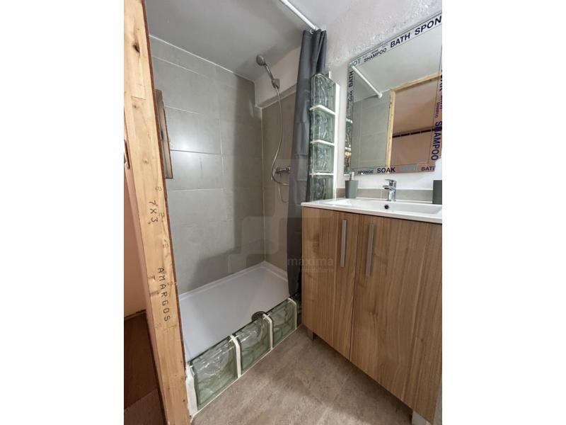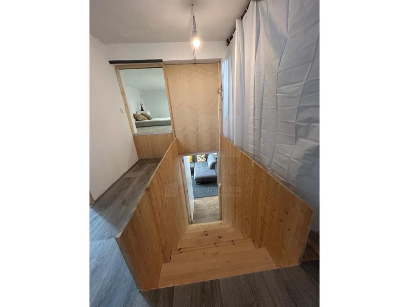 La distribución es en la planta baja: El salón, cocina americana, 1 dormitorio de matrimonio y el baño. Y en la planta de arriba nos encontramos una pequeña habitación con techo bajo, que tiene únicamente un colchón, un segundo baño, y otro especio diáfano que sirve de trastero.