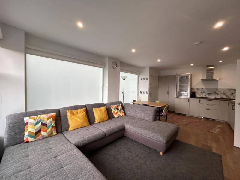 Un gran sofá y una mesa con sillas que se encuentra también junto a la cocina.