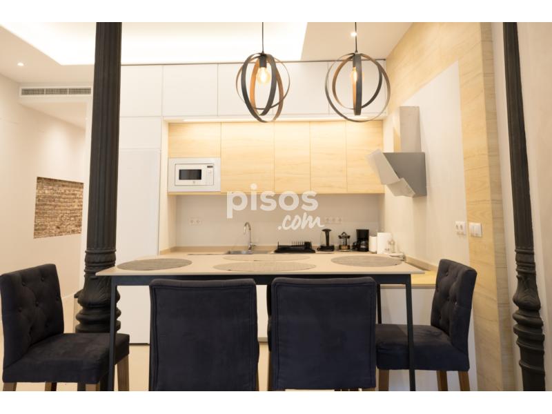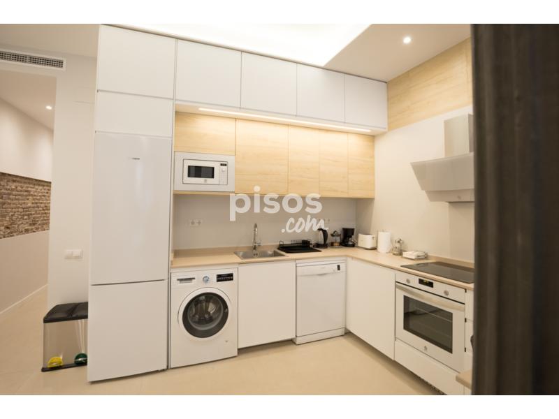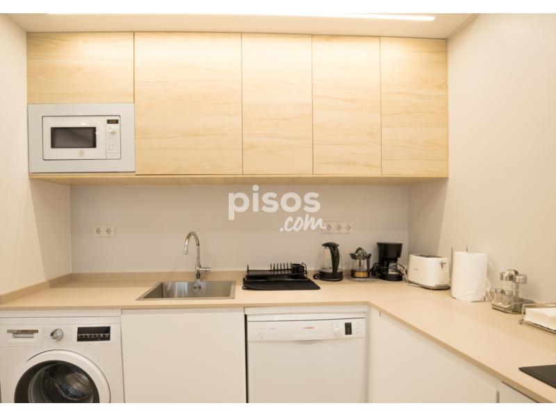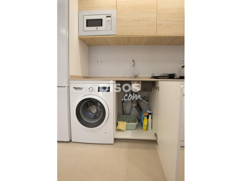 Salón con cocina integrada con todo tipo de electrodomésticos de alta gama (lavadora, lavavajillas, placa vitrocerámica, frigorífico grande combi, microondas y demás utensilios de cocina. En el salón hay un sofá-cama italiano de 2.50 convertible en cama de 1.80. y TV de 55 pulgadas.
